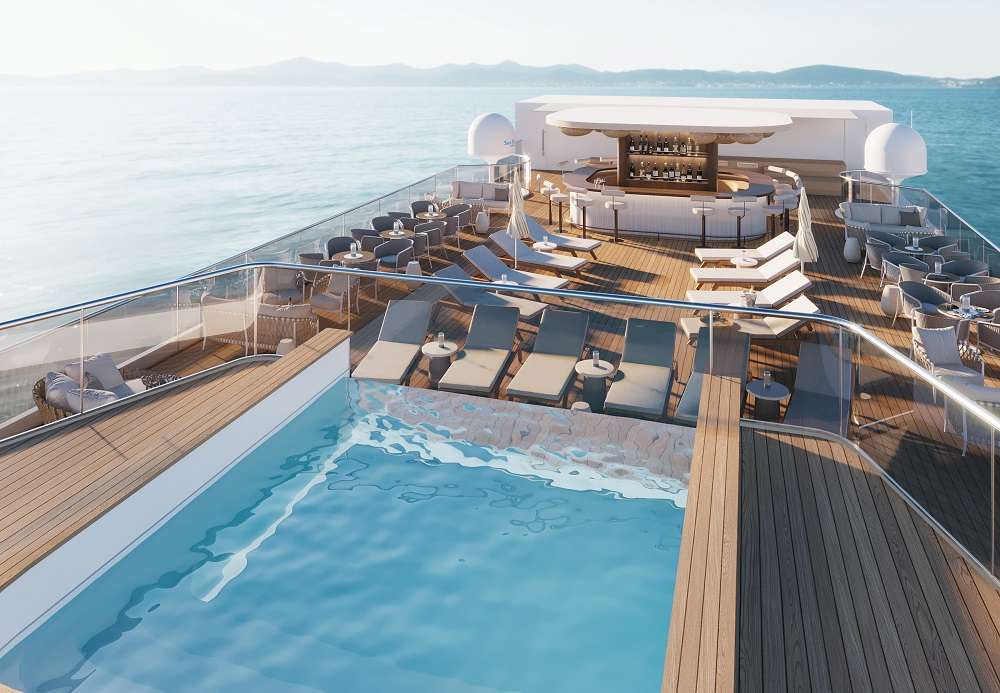 На солнечной палубе расположены солярий с шезлонгами, пейзажный бассейн с подогревом, откуда открывается потрясающий вид на закат, а также многофункциональная релакс-зона с барной стойкой 360°. Здесь гости могут с комфортом принимать солнечные ванны, любоваться пейзажами или участвовать в развлекательных мероприятиях.