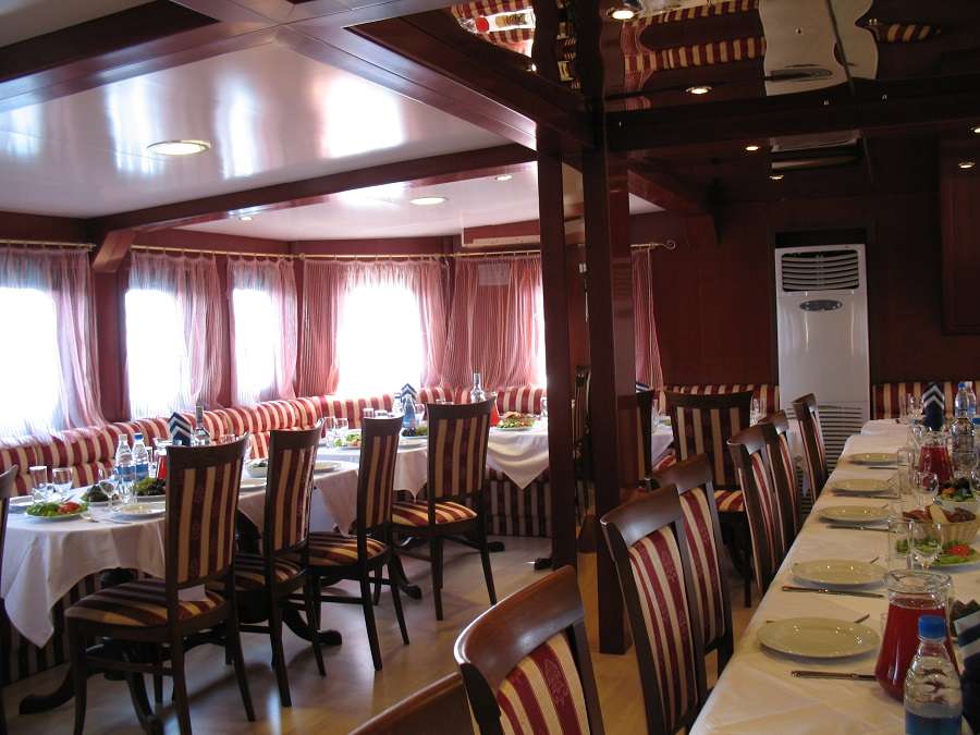 Питание осуществляется в ресторане, где гостям предлагаются завтраки, обеды и ужины, в том числе блюда байкальской кухни. В хорошую погоду для желающих столики могут быть сервированы на открытой палубе.