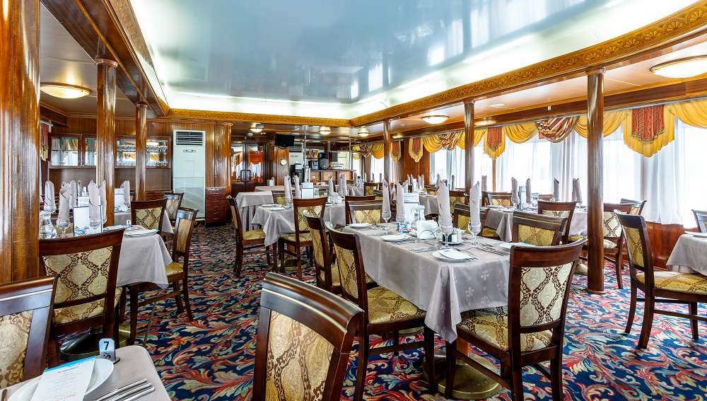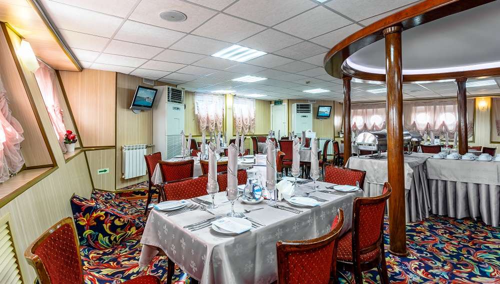 На всех теплоходе  действует единая концепция питания.  Если у вас имеются особые требования к питанию или противопоказания на определённые продукты, сообщите об этом  персоналу, и блюдо будет приготовлено индивидуально. По запросу в ресторане есть диетическое и безглютеновое меню. В обзорном лаундж-баре вам предложат напитки, десерты, холодные и горячие закуски.