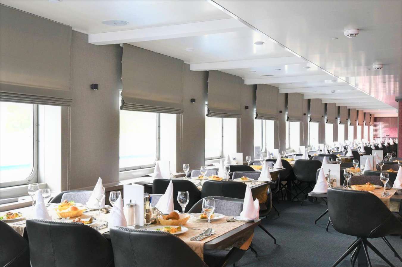 Уютный ресторан, обладающий неповторимой тёплой атмосферой, предлагает широкий выбор блюд традиционной русской и континентальной кухни. Весь персонал теплохода прошел профессиональную подготовку и гарантирует высокий уровень обслуживания. Трёхразовое сбалансированное питание в ресторане с возможностью выбора вегетарианских и низкокалорийных блюд включает: